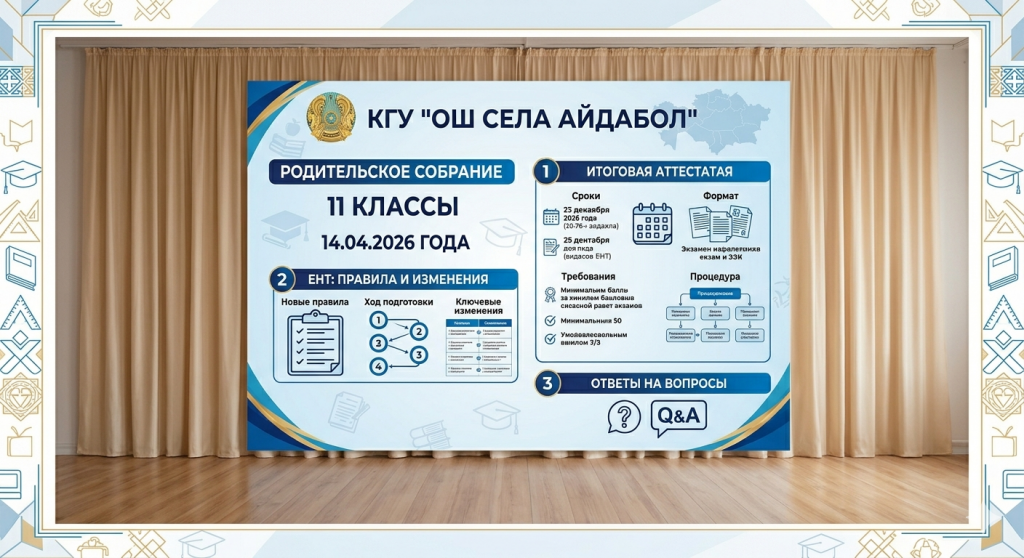 14.04.2026 жылы Айдабол мектебінде 11-сынып оқушыларының ата-аналарына арналған жиналыс өтті. Жиналыста мектеп әкімшілігі қорытынды аттестаттау емтихандарының тәртібі, өткізу мерзімдері мен талаптары туралы толық ақпарат берді. Сонымен қатар, ҰБТ-ның ережелері, дайындық барысы және маңызды өзгерістер түсіндірілді. Ата-аналар өздерін толғандырған сұрақтарын қойып, тиісті жауаптарын алды.